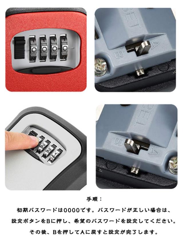 | 護カバーが汚れや腐食、錆を防ぎます。 アルミニウム合金製で、風雨に晒されても安心して使用できます。 4桁のダイヤル式で、1万通りの暗証番号を設定可能です。 鍵、カードキー、USB、印鑑などの保管に最適です。 使用例:住宅展示場、倉庫、事務所、賃貸物件、シェアオフィス、店舗、会議室の鍵管理に最適で、屋内外問わず利用できます。 手順: 初期パスワードは0000です。パスワードが正しい場合は、設定ボタンをBに押し、希望のパスワードを設定してください。その後、Bを押してAに戻すと設定が完了します。 | |