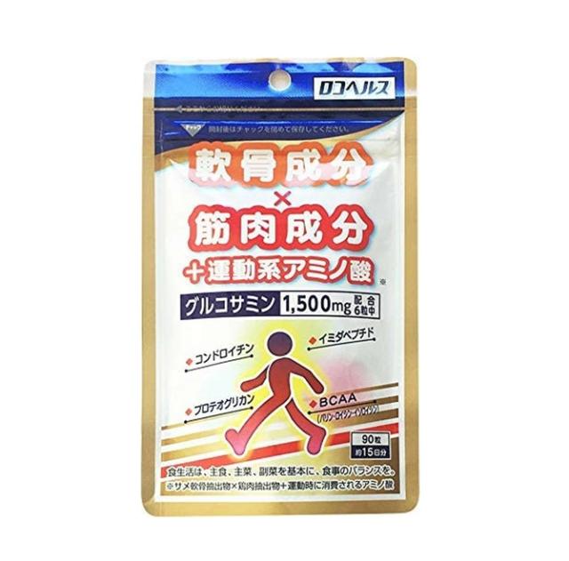 軟骨成分(コンドロイチン硫酸=サメ軟骨抽出物/プロテオグリカン=サケ抽出物)と筋肉成分(イミダペプチド=鶏肉抽出物)にグルコサミンと運動系アミノ酸BCAA(バリン、ロイシン、イソロイシン)を配合した栄養補助食品です。スムースな歩みのための軟骨成分とグルコサミンに加え、力強さに不可欠な筋肉成分とBCAAを組み合わせることで自立した生活をサポートします。グルコサミン1,500mg配合。