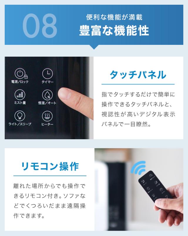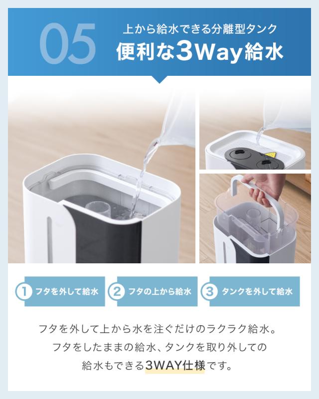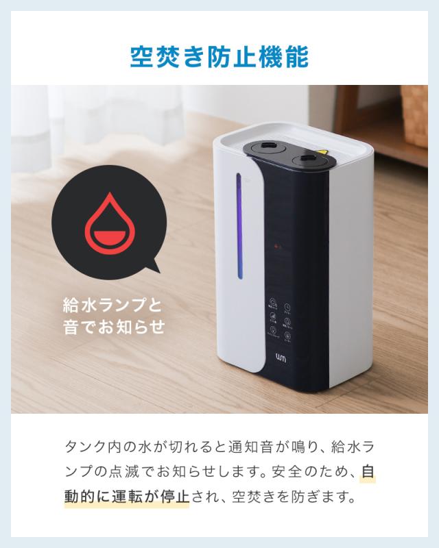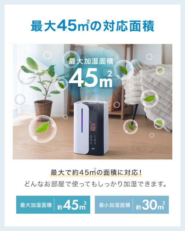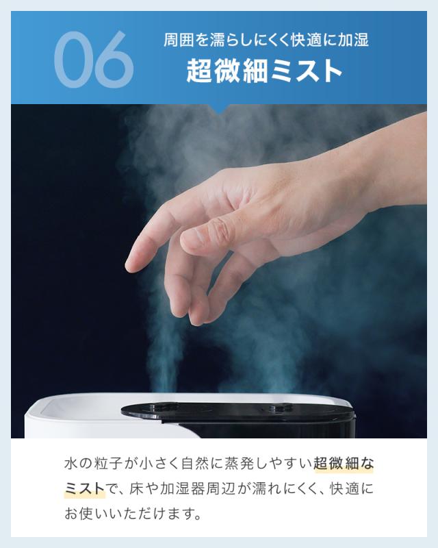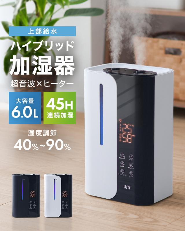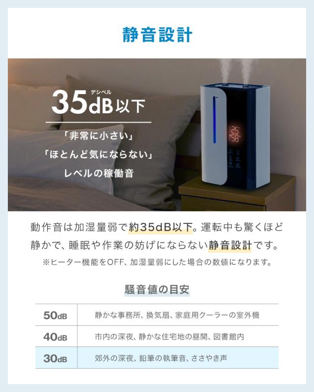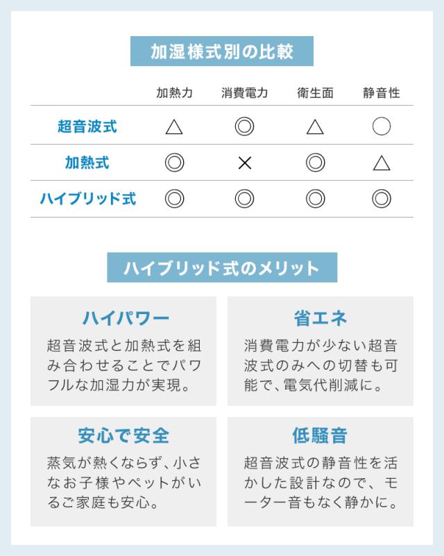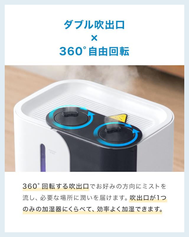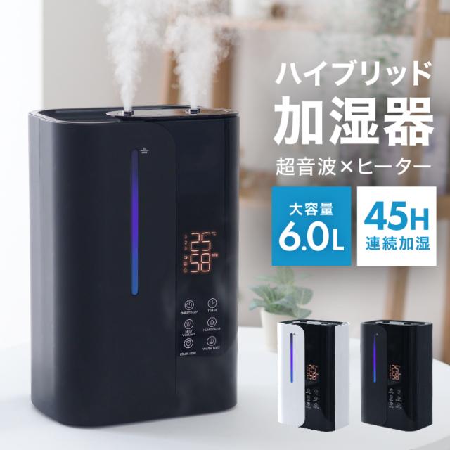 | 特徴 | ハイブリッドで省エネ 超音波×ヒーター 360度W吹き出し口 ムラなく加湿 6段階加湿モード 6モードの加湿ができる カンタン3way給水 簡単な上部給水 静音設計 最大35? 超便利恒湿モード 40%〜90%に設定すれば、自動運転 6L大容量 最大45H連続運転 超微細ミスト 3μm効率よく優しく潤う 安全設計 チャイルドロック&空焚き防止 豊富な機能性 スリープモードやタイマー機能便利な機能満載 |
