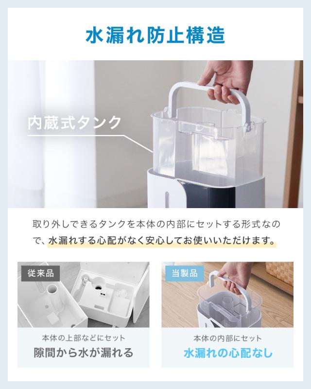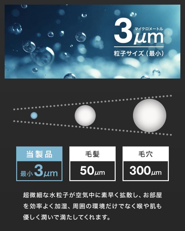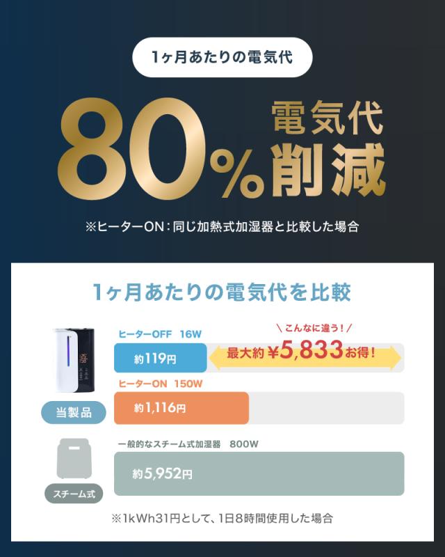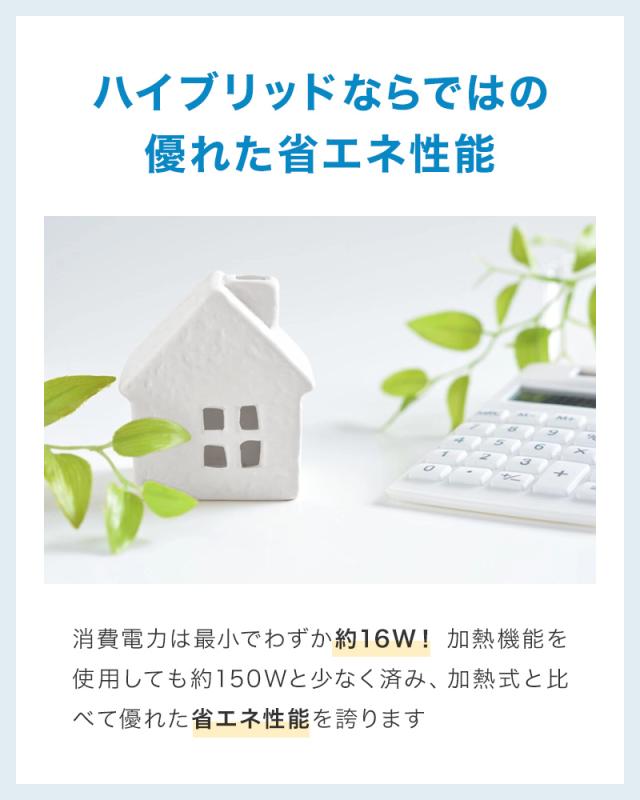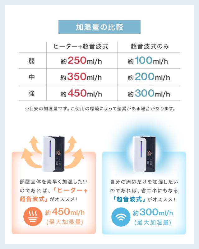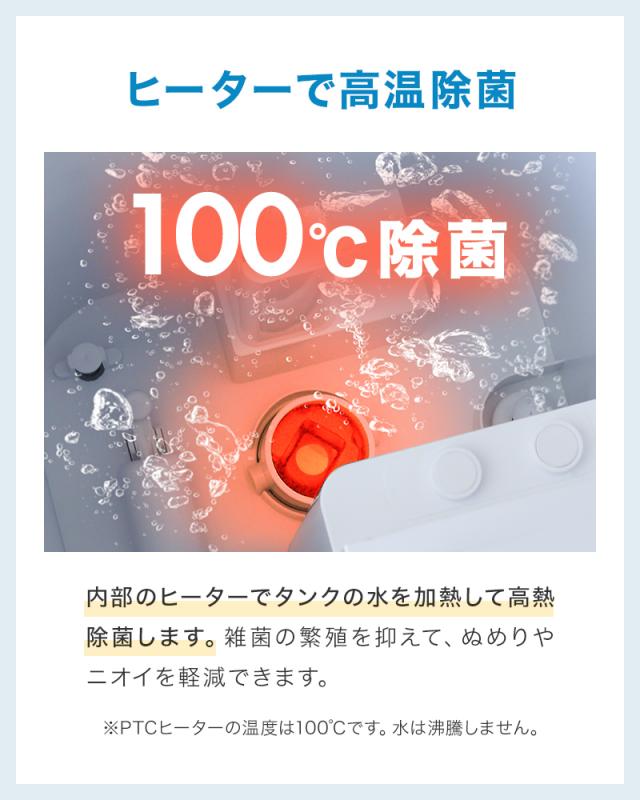 | 加湿量 | 1段階 ヒーターON:250ML/H ヒーターOFF:100ML/H 2段階 ヒーターON:350ML/H ヒーターOFF:200ML/H 3段階 ヒーターON:450ML/H ヒーターOFF:300ML/H |