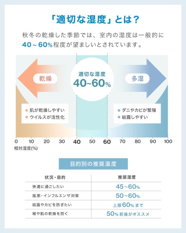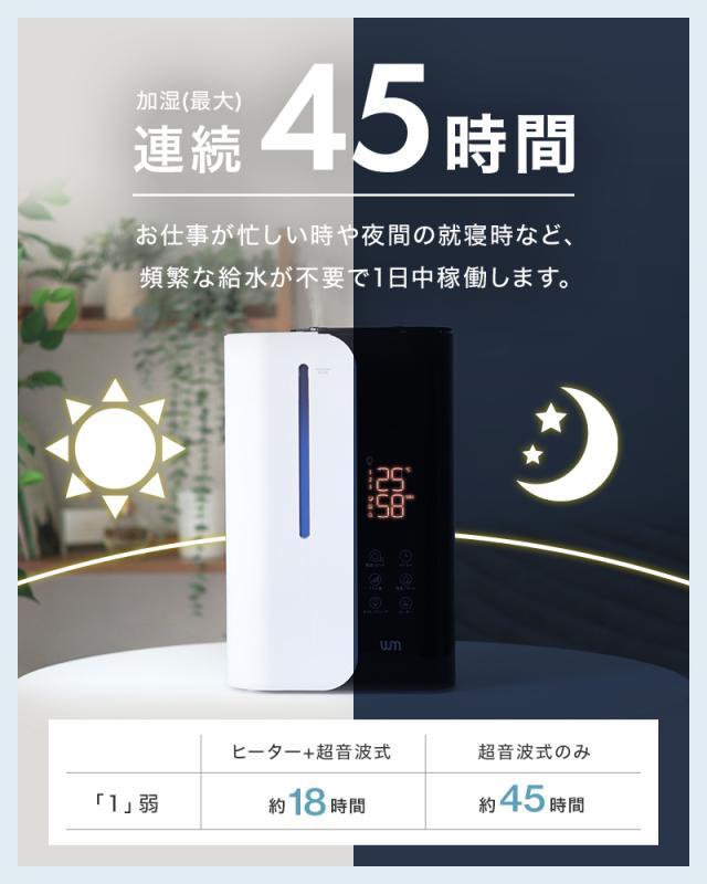| 連続加湿時間 | ミスト量1 ヒーター併用:18時間 ヒーターOFF:45時間 |