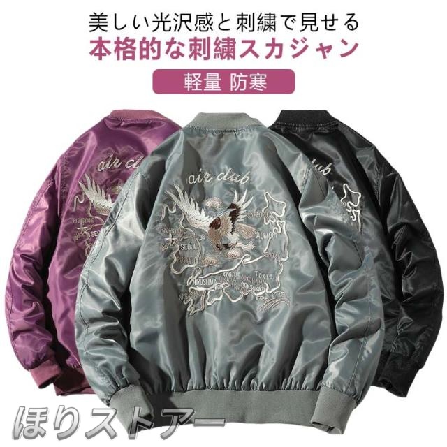 スカジャン 和柄 スカジャン サテンスカジャン ブルゾン フライトジャケット 光沢 ジャケット ジャンパー MA-1 ブルゾン 中綿 メンズ 暖かい サテン 刺繍 アウター 軽量 防寒 防風 スカジャン ヴィンテージ アメカジ 秋 冬