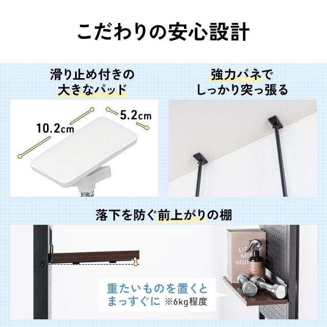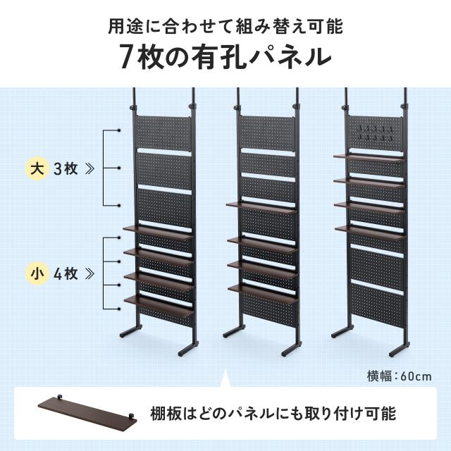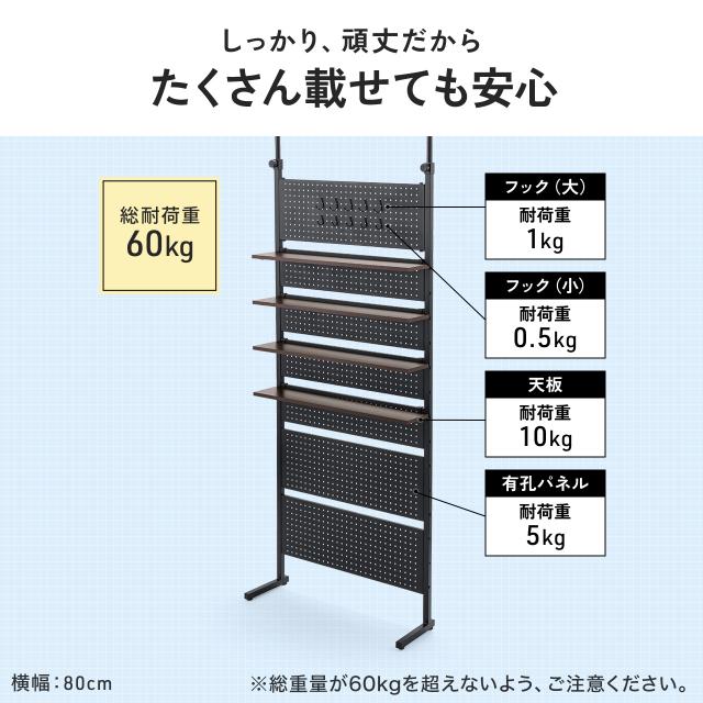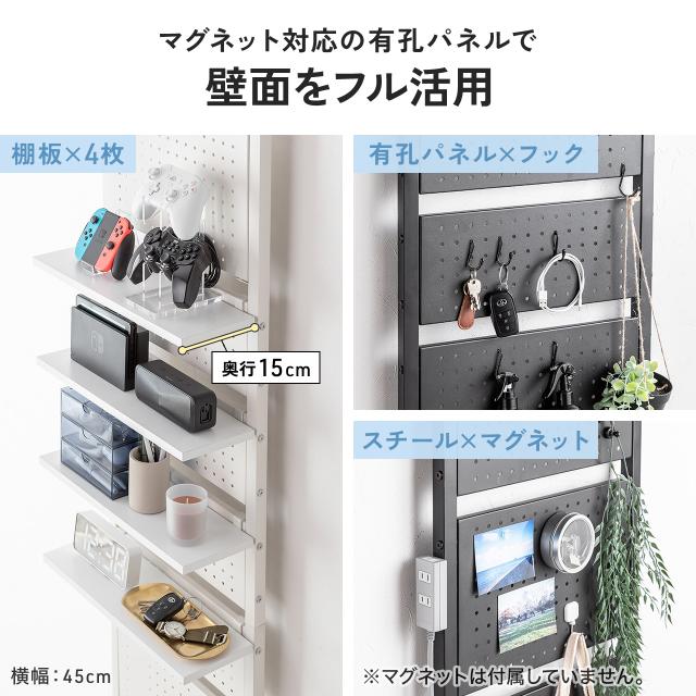 ●突っ張るだけの簡単設置。壁面を収納として活用できる突っ張りラックです。●有孔ボードのパネルなので、フックをかけたり、マグネットを取り付けたり自由に収納できます。
