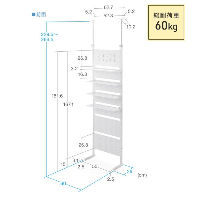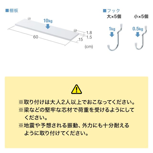 ■総耐荷重:60kg(各棚板/10kg、フック大/1kg、フック小/0.5kg)
