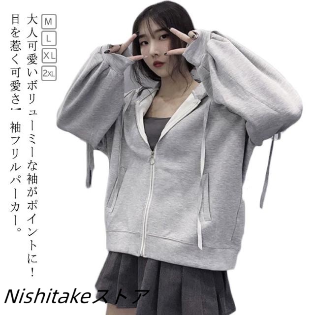 フリルパーカー フード付き ジャケット フリルパーカー スウェット レディース フリル カジュアル 春秋 トップス パーカー ボリュームシルエット 大人可愛い ジャケット エレガント フェミニン グレー 大人可愛い