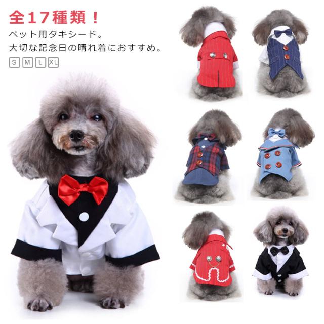 | 全17種類!ペット用タキシード。大切な記念日の晴れ着におすすめ。 家族の御祝い事への参加時はもちろん、イベント時など視線を釘付け! 背中のボタンのアクセントや首元のリボンなどおしゃれ要素がイロイロ。 お誕生日、うちの子記念日、節句や七五三などなど記念日の撮影にもぴったりです。 | |