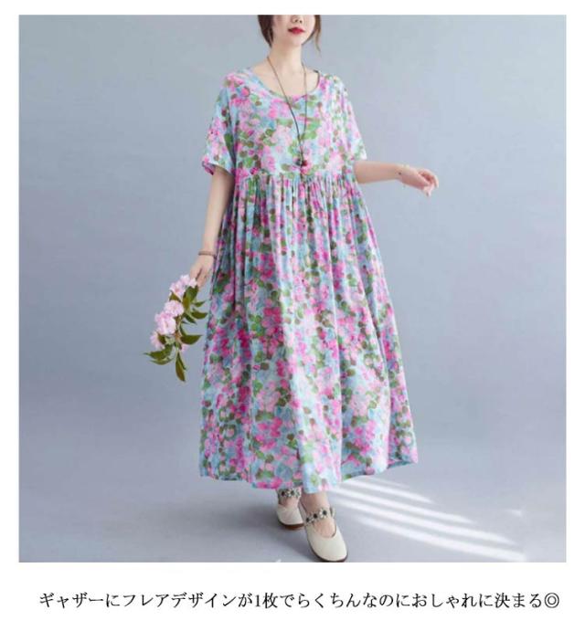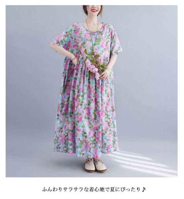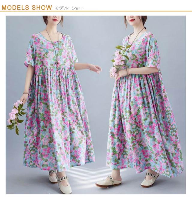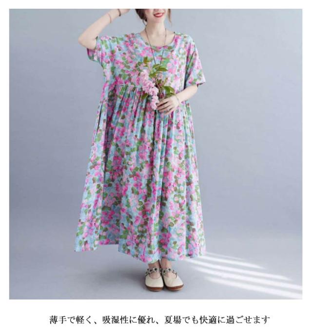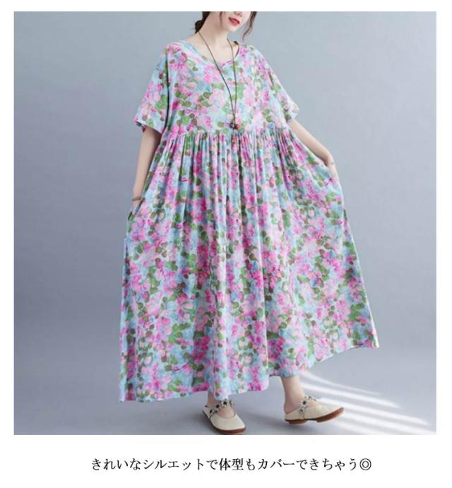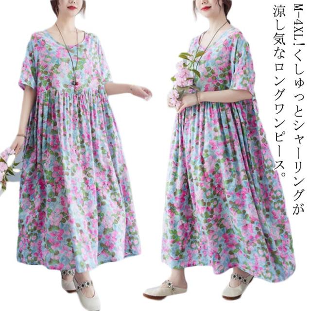 夏柄 ワンピース リゾートワンピース レディース 花柄 薄手 サマードレス ロング マキシ丈ワンピース 半袖 ロング ロングワンピース 体型カバー 無地 細見え 着痩せ 涼しい Aライン 大人 20代 30代 40代 可愛い お洒落 M L XL 2XL 3XL 4XL 送料無料