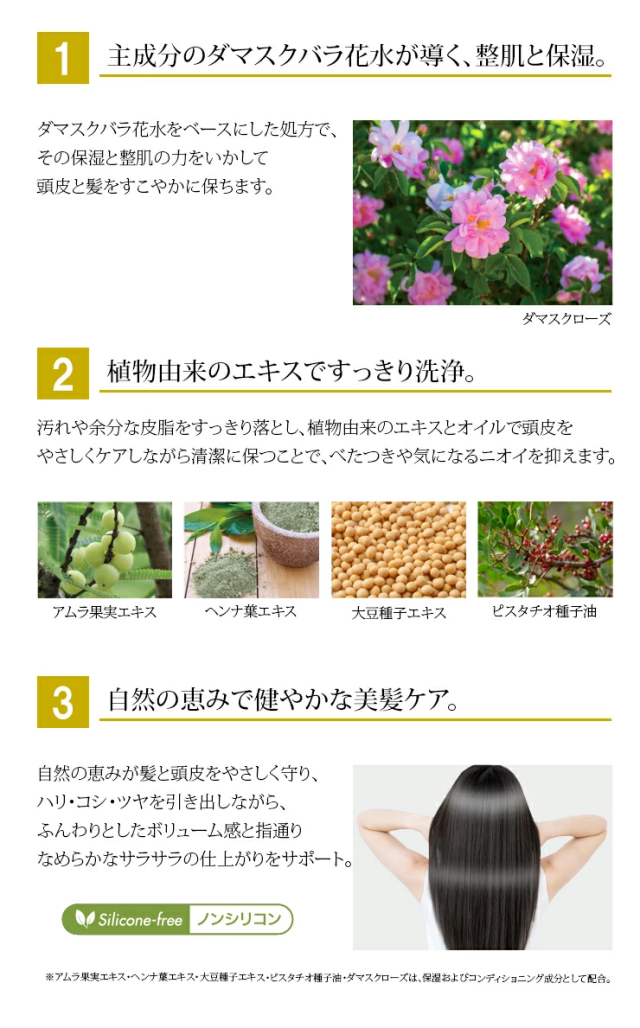 | 【髪と地肌をしっとりと洗い上げる、弱酸性のボタニカルシャンプー】 抜け毛が多くなった、、、、現状をキープしたいと思ったら、ヘンナ葉エキス※やカンゾウ根エキス※などの天然成分で頭皮にパワーを。 シャンプーだけでトリートメントをしたようなしなやかな髪に。ローズの優雅な香りがあなたをやさしく包みます。 ※ 保湿成分 ○カンゾウ、アムラなど植物由来のエキスを配合。頭皮や毛髪を洗浄にしながらすこやかに保ち、ボリュームアップをサポートします。 ○保湿成分として、ヘンナ葉エキスも配合。シャンプーだけでリンスをしたかのようなコシやツヤを与え、しなやかな髪に。 (ヘンナによって髪に色がつくことはありません) ○ローズの優雅な香り。甘くリッチな香りに包まれて毎日のシャンプーを。 <使用期限について> 未開封の状態で製造から3年です。直射日光、高温多湿を避けて常温保存し、開封後はなるべく早くご使用ください。 |