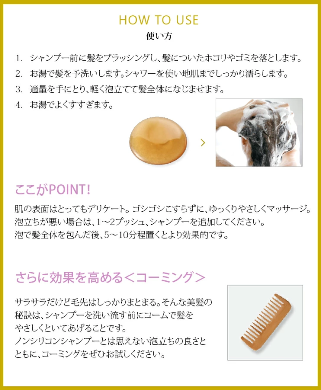 1.シャンプー前に髪をブラッシングし、髪についたホコリやゴミを落とします。 2.お湯で髪を予洗いします。シャワーを使い地肌までしっかり濡らします。 3.適量を手にとり、軽く泡立てて髪全体になじませます。 4.お湯でよくすすぎます。 【ここがPOINT!】 ○肌の表面はとってもデリケート。 ゴシゴシこすらずに、ゆっくりやさしくマッサージ。 ○泡立ちが悪い場合は、1〜2プッシュ、シャンプーを追加してください。 ○泡で髪全体を包んだ後、5〜10分程置くとより効果的です。 |