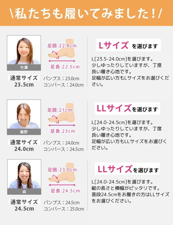 取り扱いサイズ:S[22.5-23cm] M[23-23.5cm] L[23.5-24cm] LL[24-24.5cm]