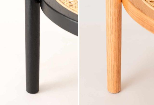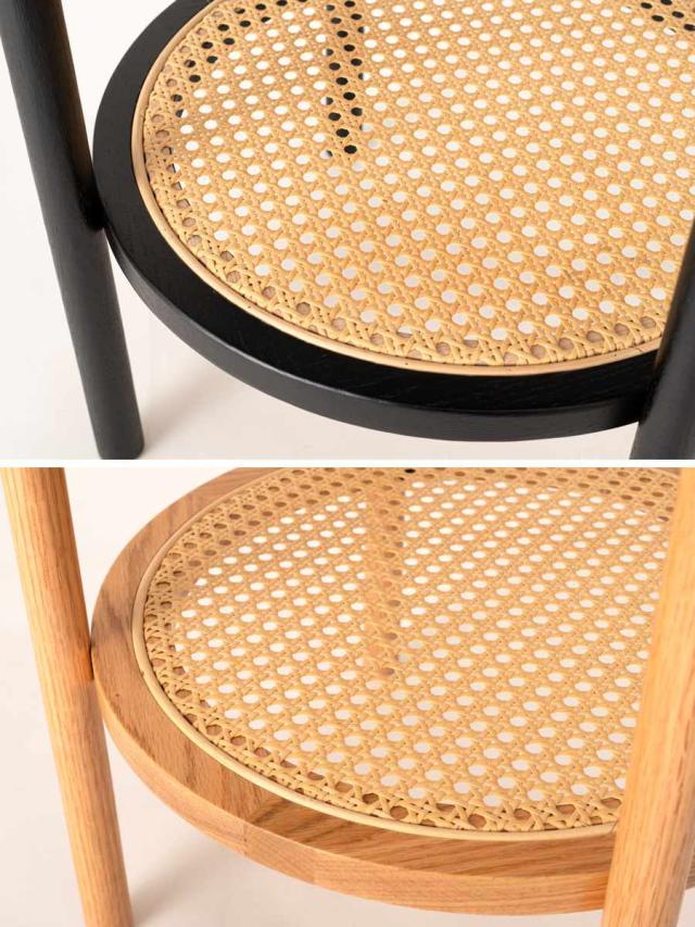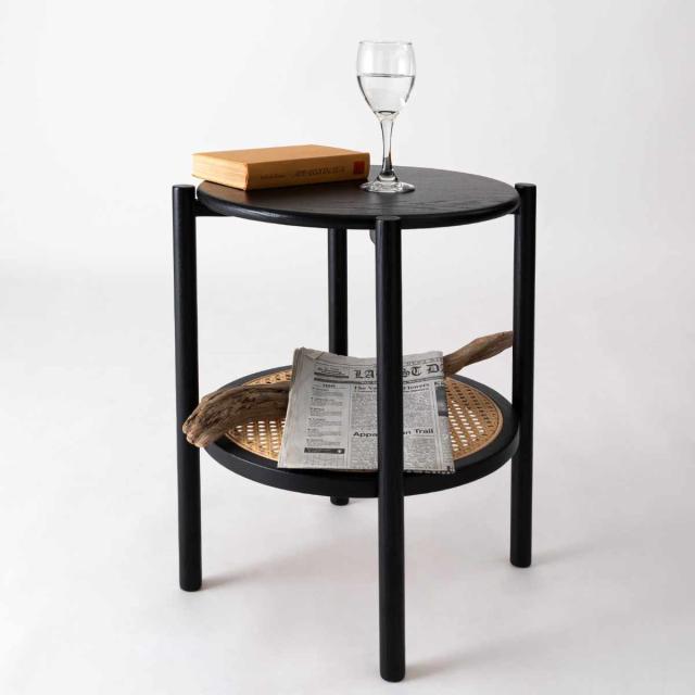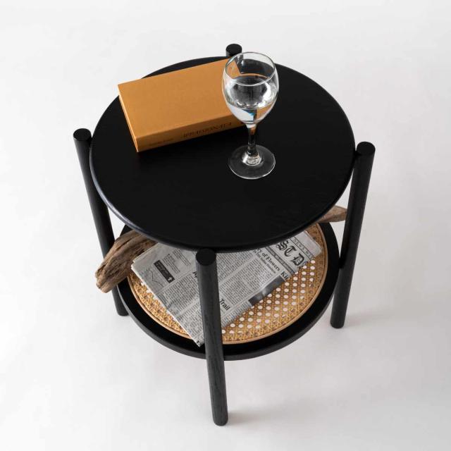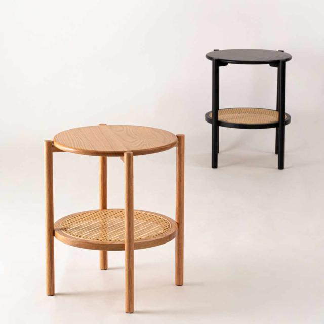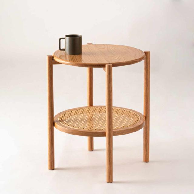 美しいオーク材の天板に、アクセントとなる人工ラタンの棚板をプラスしたサイドテーブルです。天板はエッジの角を落とし、細身の丸脚と組み合わせることで、優しくモダンな印象に。