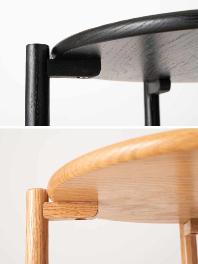 天板を支える脚部は、手触りの良い丸脚を採用。天板と同じオーク材を使用することで、より温かみのある雰囲気に仕上がります。