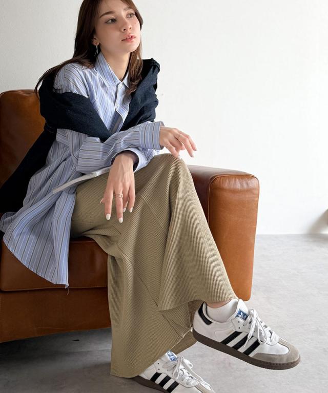 裾にかけてふんわりと広がるフレアラインが、歩くたびにしなやかに揺れ、大人の余裕あるカジュアルを完成させてくれます。