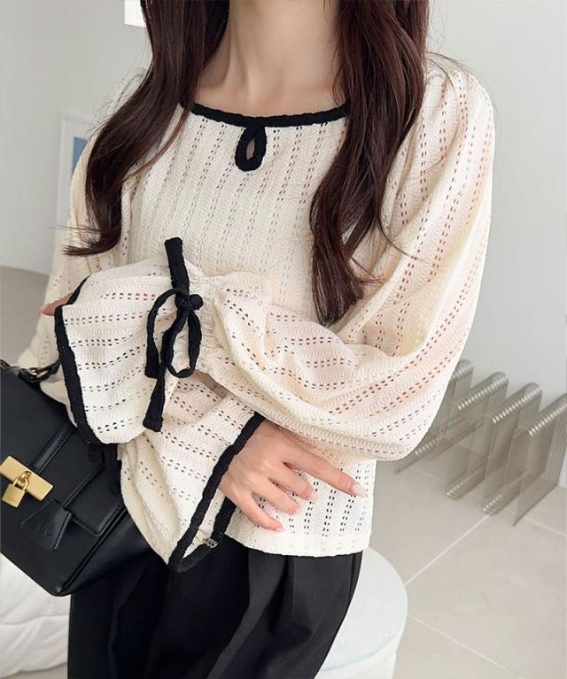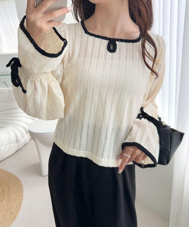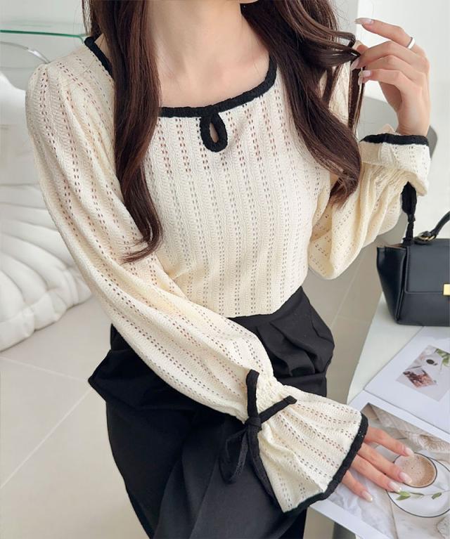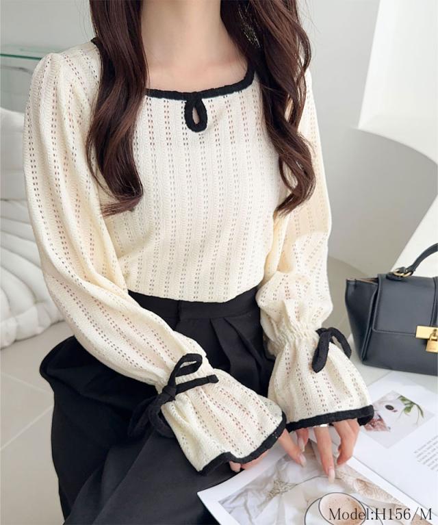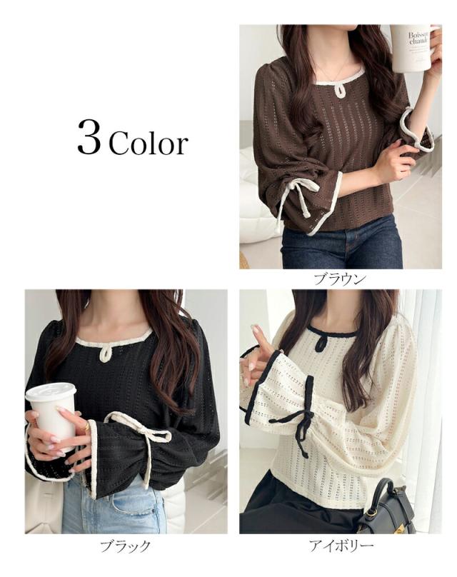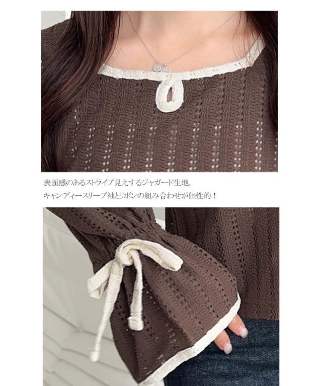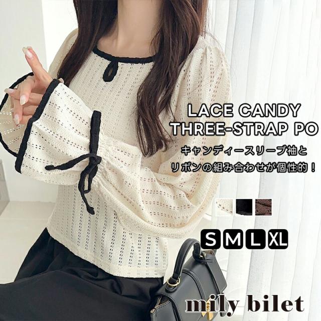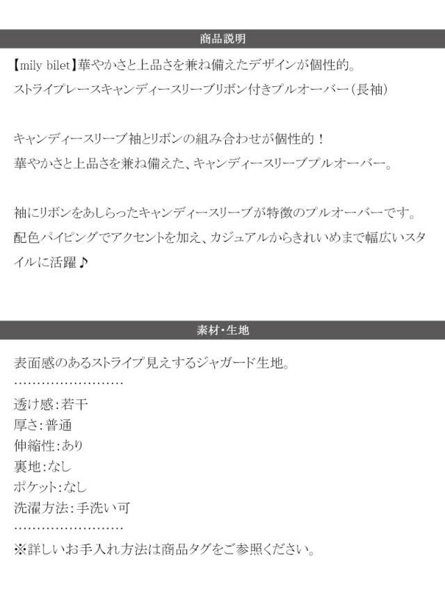 クラシカルエルフ秋新作 mily bilet トップス Tシャツ レディース ストライプ レース キャンディー スリーブ リボン 付き 配色 パイピング プルオーバー 長袖 大きいサイズ 2025aw mi1019104