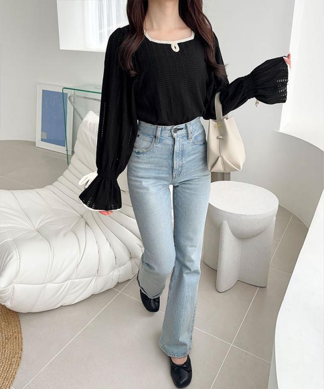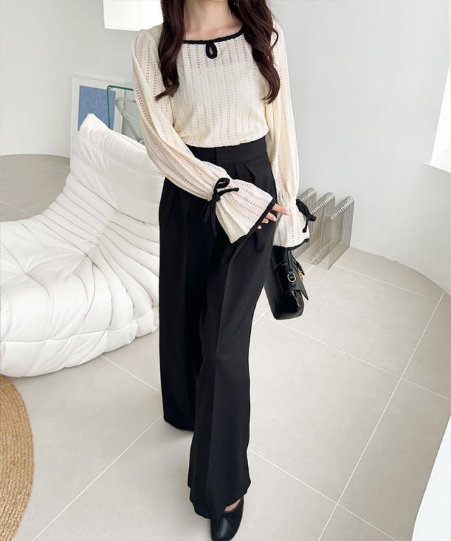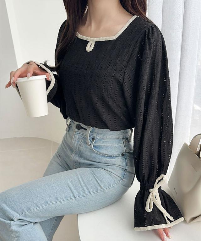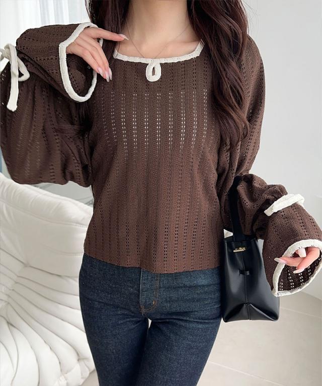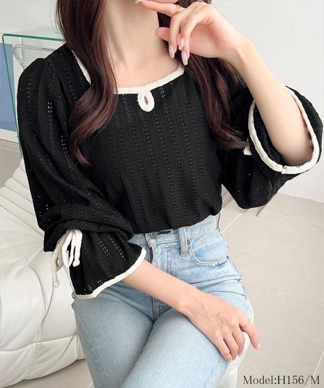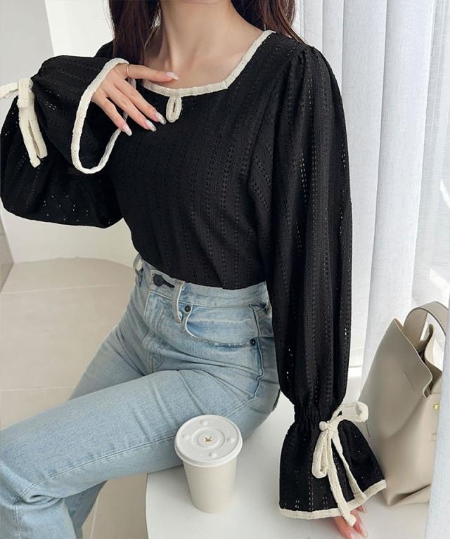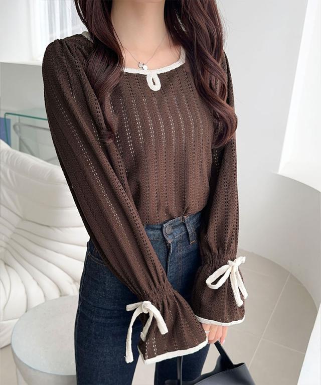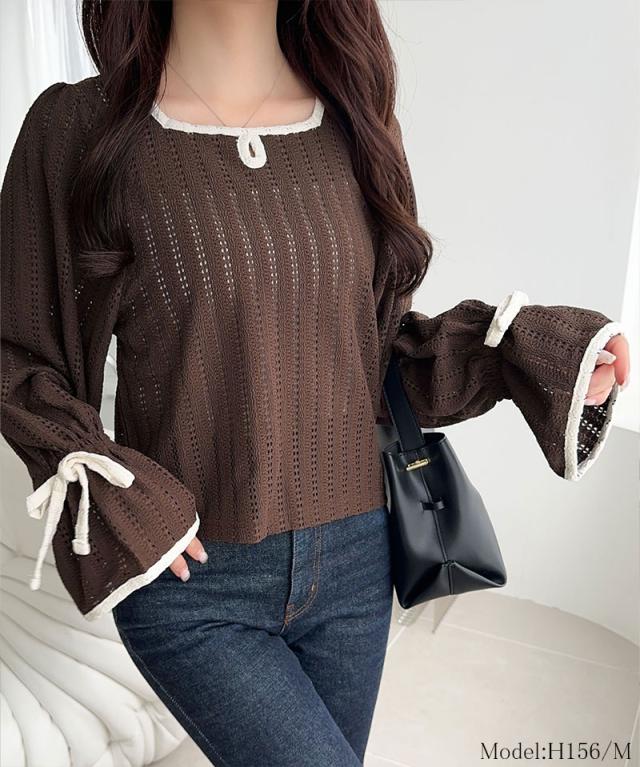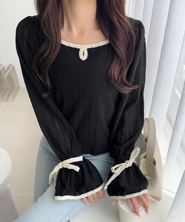 クラシカルエルフ秋新作 mily bilet トップス Tシャツ レディース ストライプ レース キャンディー スリーブ リボン 付き 配色 パイピング プルオーバー 長袖 大きいサイズ 2025aw mi1019104