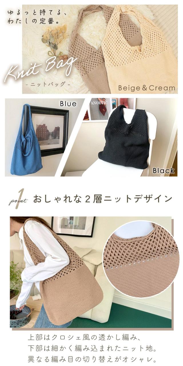 涼しげで透け感のあるかぎ編み風デザインが魅力のニットバッグ。