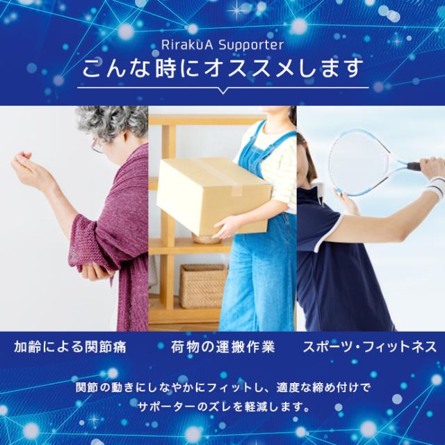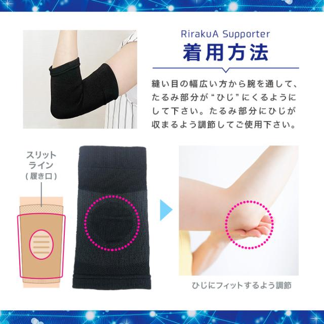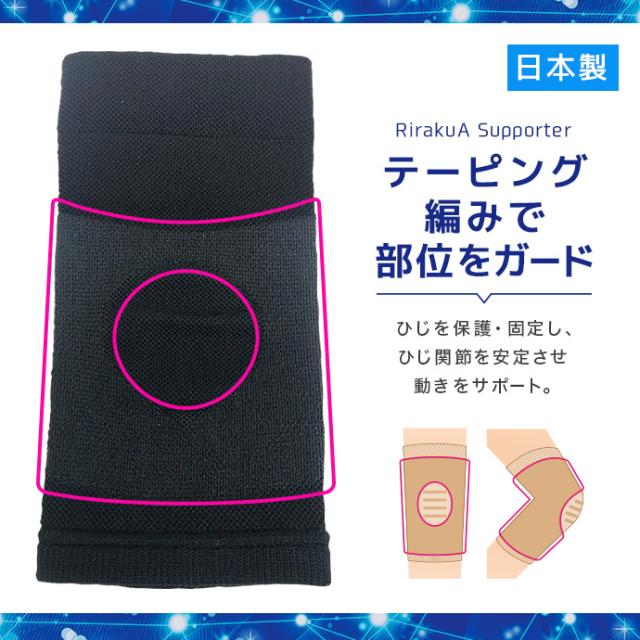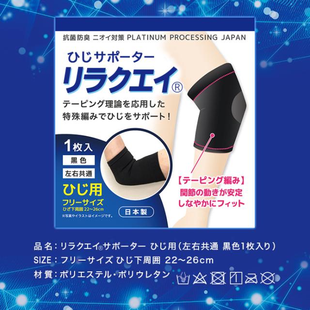 テーピング理論を応用した特殊編みでひじをサポート リラクエイ®サポーター ひじ用1枚入 ・サイズ:フリーサイズ ひじ下周囲22〜26cm(左右共通) ・カラー:黒 ・材 質:ポリエステル・ポリウレタン 日本製 |
