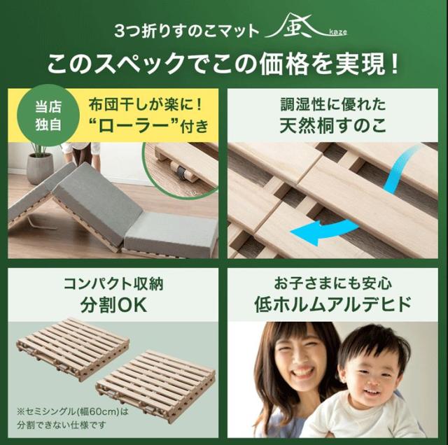 すのこベッド シングル 3つ折り 頑丈タイプ 桐 すのこマット 3つ折り カビ対策 湿気対策 ベッド すのこ すのこベッド 折りたたみ 三つ折り 折り畳み 折りたたみベッド 折りたたみ 二分割