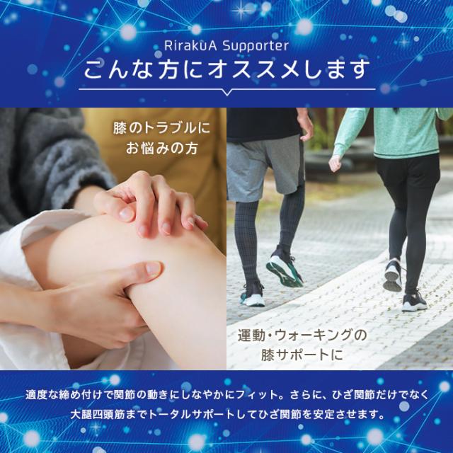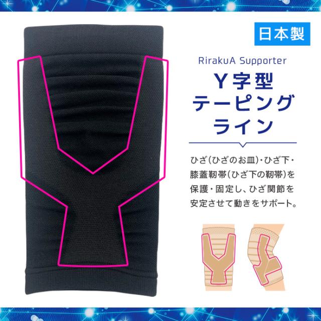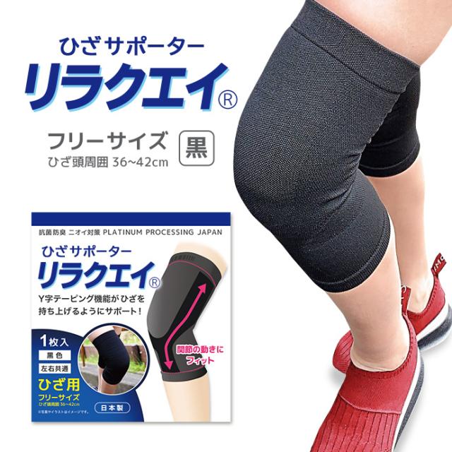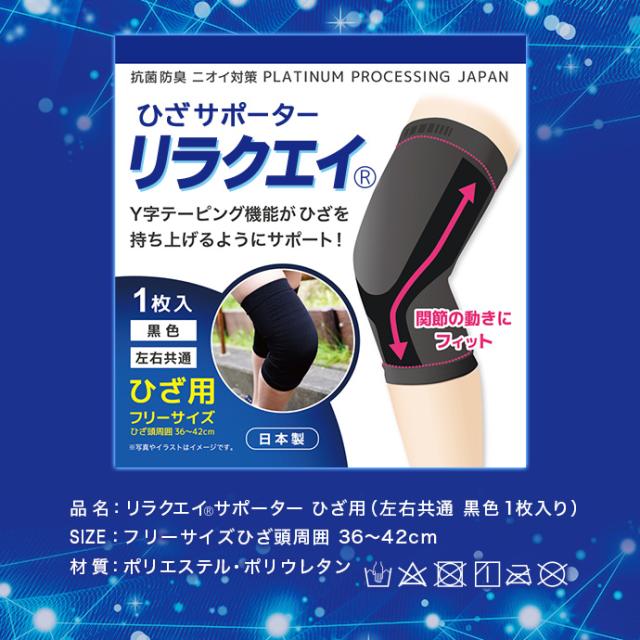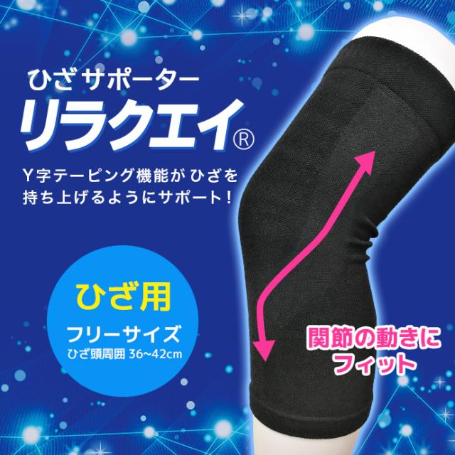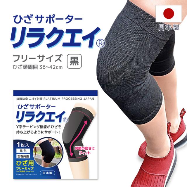 Y字テーピング機能がひざを持ち上げるようにサポート リラクエイ®サポーター ひざ用1枚入 ・サイズ:フリーサイズ ひざ頭周囲36〜42cm(左右共通) ・カラー:黒 ・材 質:ポリエステル・ポリウレタン 日本製 |