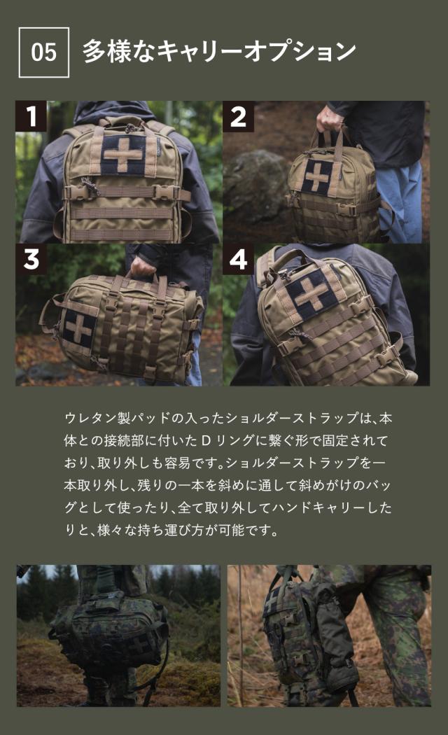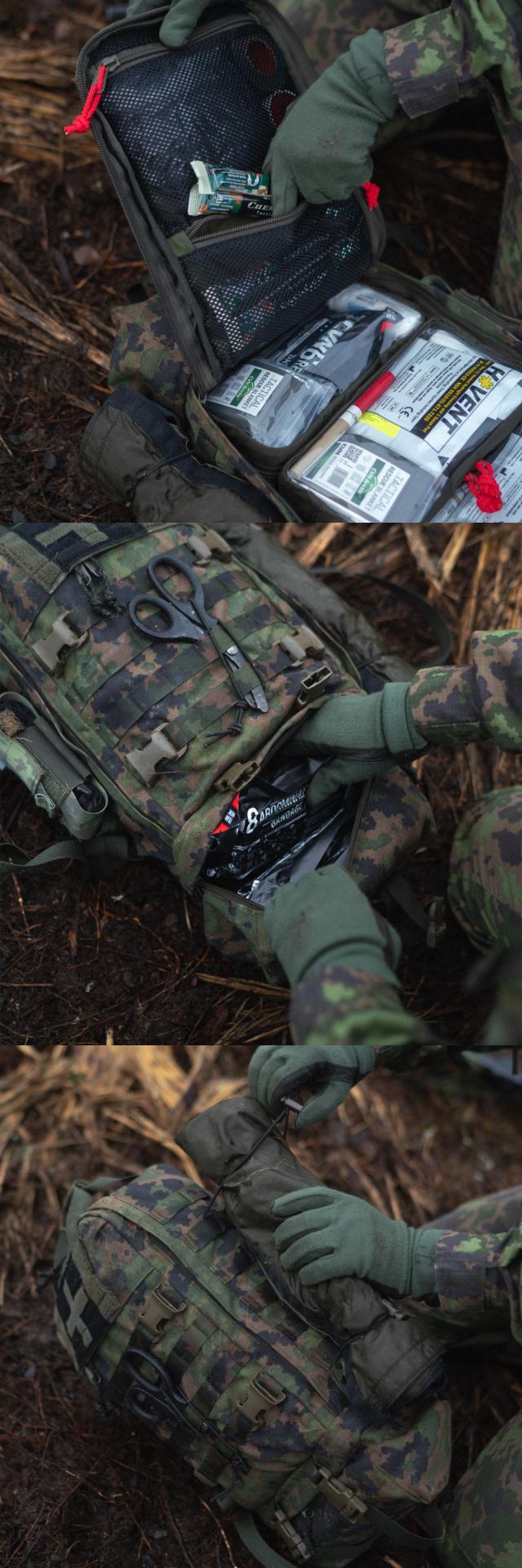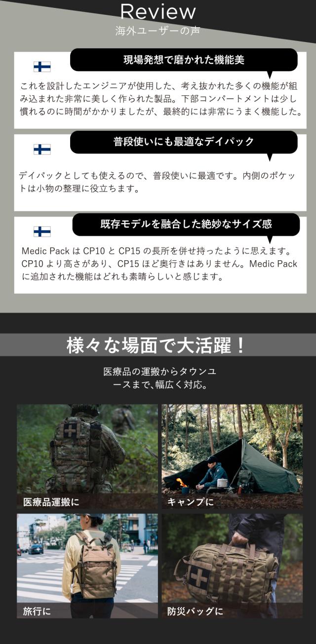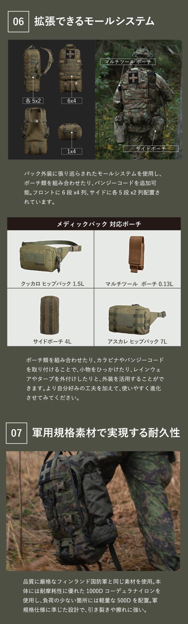 「メディックパック 18L」は、軍用のメディカルパックを必要としていたクライアントと共同開発を行ったプロダクトです。特定の装備に特化せず、様々な構成に対応可能な多用途デザインで、フィンランド国防軍の現行M20メディックパック全装備を収納することが可能となっています。パック全体の豊富な機能により、整理しながらたくさんの荷物を詰められることから、医療品の運搬以外にも、デイキャンプ、タウンユースなど、様々なシーンで活躍します。
