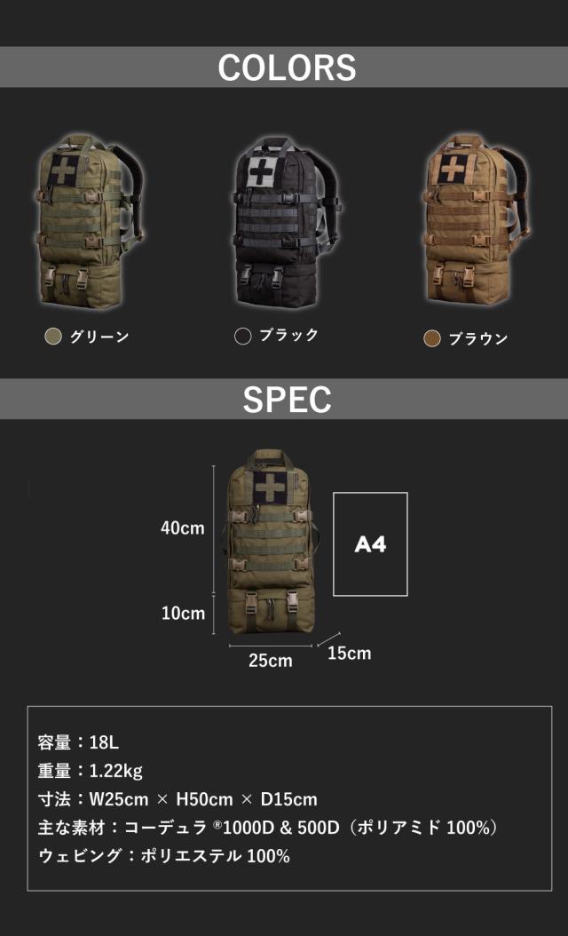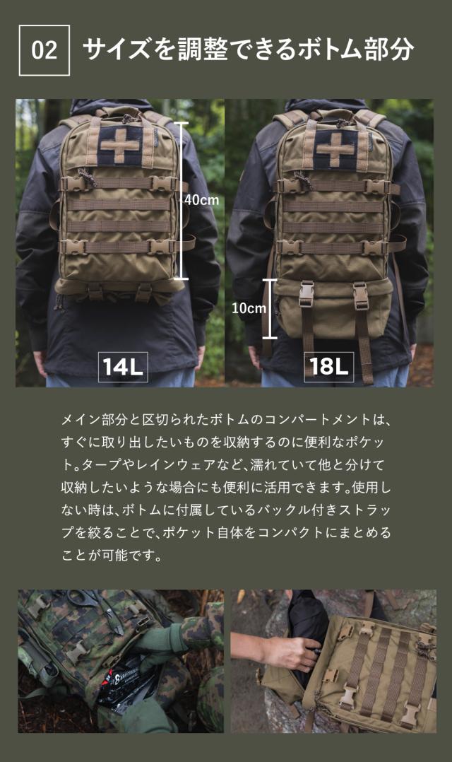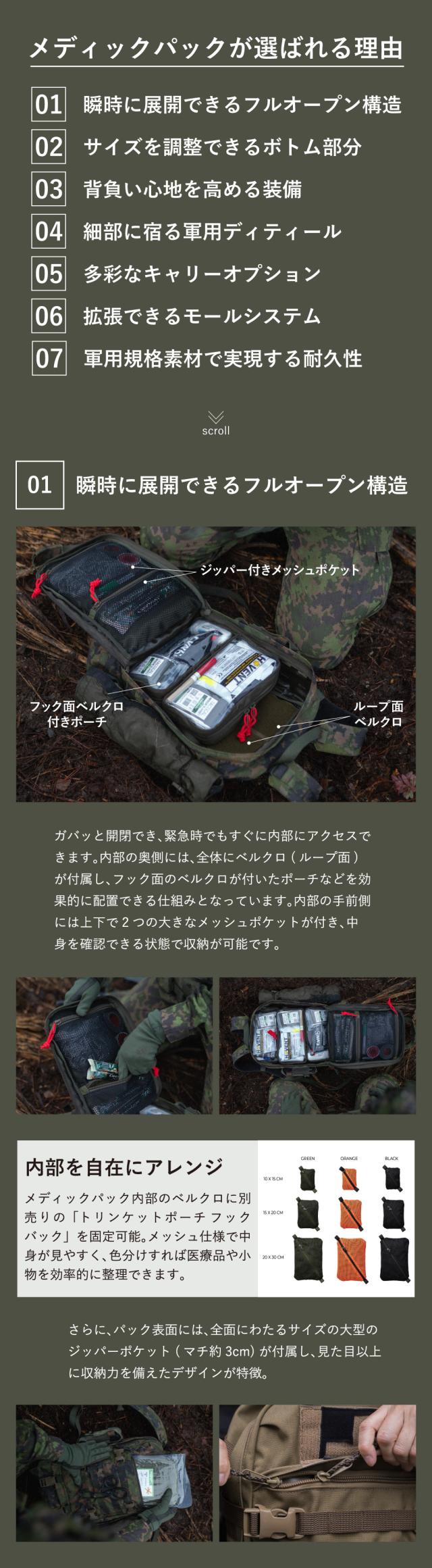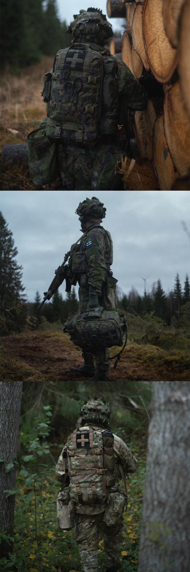 「メディックパック 18L」は、軍用のメディカルパックを必要としていたクライアントと共同開発を行ったプロダクトです。特定の装備に特化せず、様々な構成に対応可能な多用途デザインで、フィンランド国防軍の現行M20メディックパック全装備を収納することが可能となっています。パック全体の豊富な機能により、整理しながらたくさんの荷物を詰められることから、医療品の運搬以外にも、デイキャンプ、タウンユースなど、様々なシーンで活躍します。