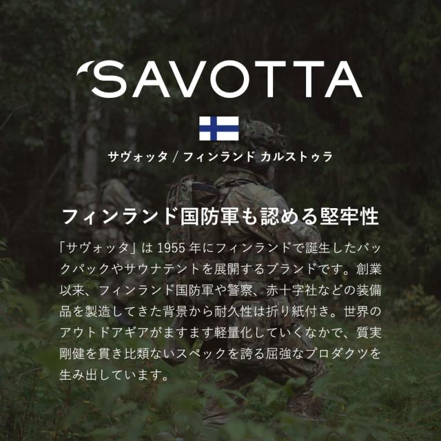 「サヴォッタ」は1955年に北欧フィンランドで創業以来、一般的なアウトドアギアのみならず、軍隊や警察、国境警備隊、赤十字社など特殊な環境下で行動するプロフェッショナル向けの装備品を製造してきました。特にフィンランド国防軍とは50年以上にわたって提携関係を結び、命に関わる現場で求められる厳格な要求に応え続けてきました。現行のプロダクトの大半は国防軍の装備品と同じ素材を使用し製造されており、強度や耐摩耗性、耐久性は折り紙付きです。「アウトドアで使う道具は簡単に壊れてはいけない」という考えのもとで質実剛健なプロダクトを作る一方、スマイルマークの描かれたパッチやストーブを作ったり、ユーモアに溢れた動画を発信したりと、遊び心も持ち合わせている魅力的なブランドです。