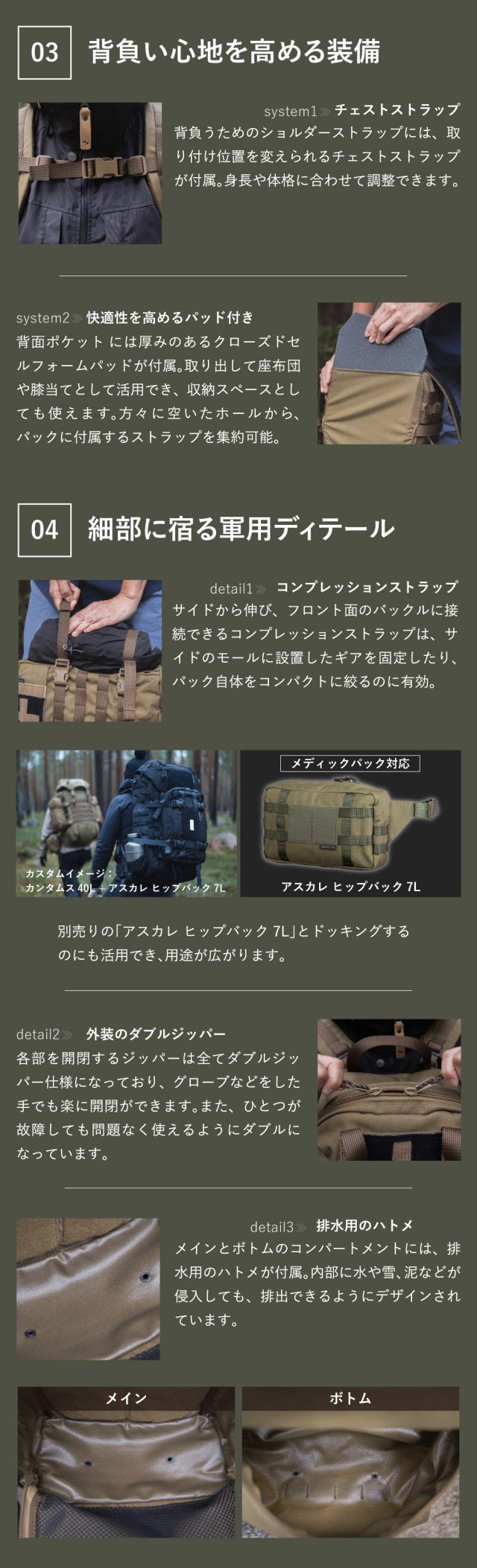 バックパックのフロントとサイド、ボトムにはモールシステムが付属。ポーチ類を組み合わせたり、カラビナやバンジーコードを取り付けることで、小物をひっかけたり、レインウェアやタープを外付けしたりと、外装を活用することができます。付属のバックルを利用して、7Lのヒップパック「アスカレ ヒップパック」などをドッキングさせるのもおすすめ。より自分好みの工夫を加えて、使いやすく進化させてみてください。