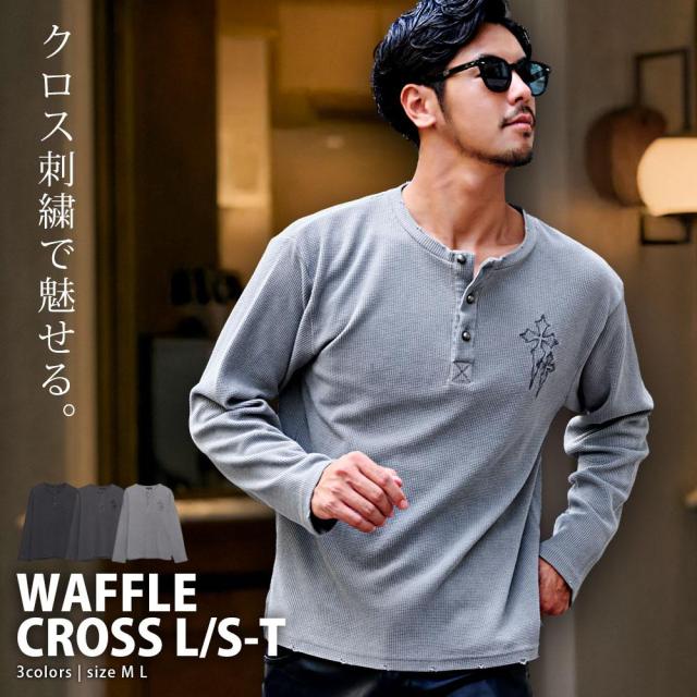 Tシャツ メンズ ブランド おしゃれ ロンT 長袖 ワッフル 長袖Tシャツ トップス カットソー クルーネック 通気性 吸汗速乾 保温性 軽量 柔らかい ブラック グレー 黒 シンプル ナチュラル ヴィンテージ風 クロス 十字架 刺繍 大人 M L 20代 30代 40代 50代 クール ユニセックス 男性 男 服 秋 秋服 春 冬 ファッション メンズファッション 東京 プレゼント 誕生日 記念日 贈り物 ギフト配送について
