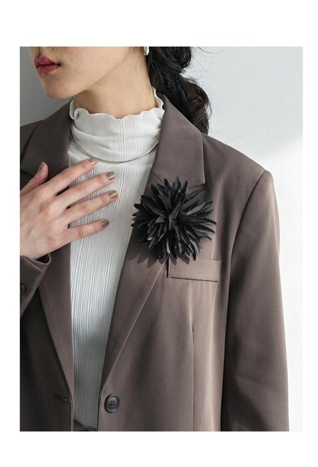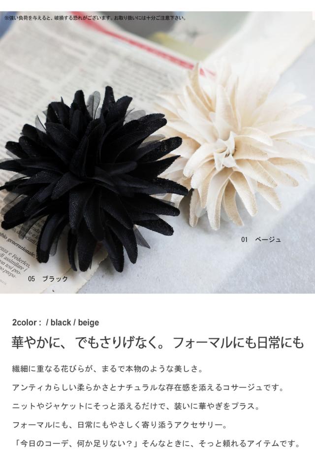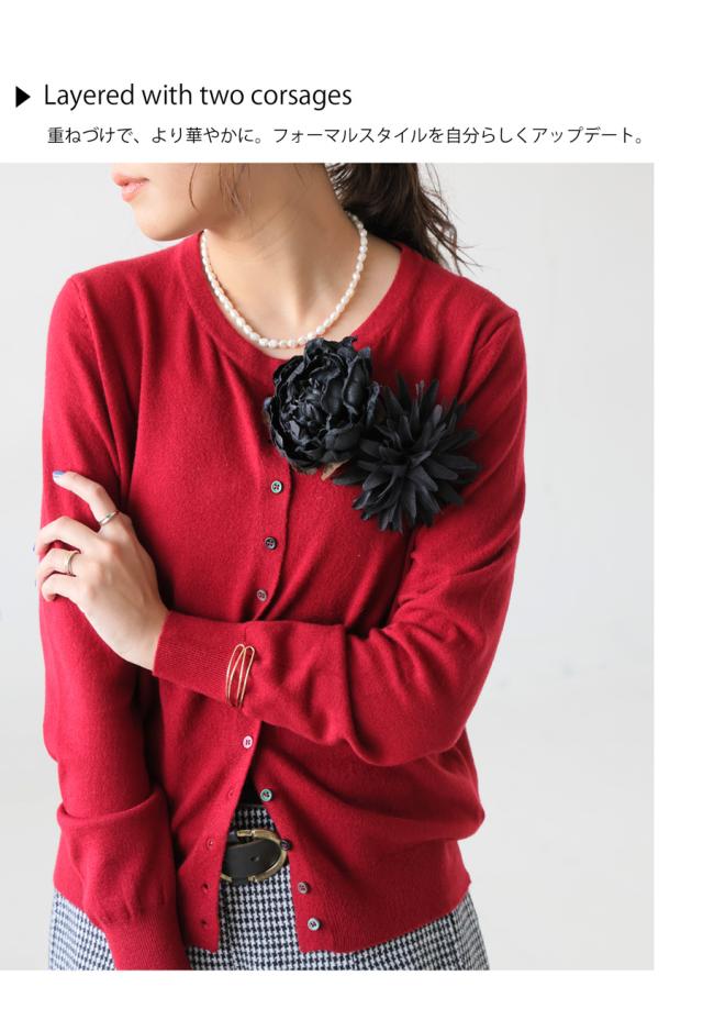 繊細に重ねた花びらが本物のような美しさを演出する、布製のフラワーコサージュです。