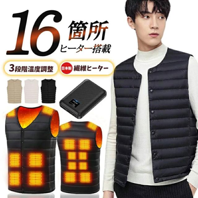 電熱ベスト バッテリー 30000mAh 日本製16枚繊維ヒーター MAX約70℃ 発熱ベスト 3段温度調整 防寒ベスト ヒーターベスト ヒーター 付き 加熱ベスト インナー 電気ベスト レディース メンズ 防寒 速暖 電熱ウェア 男女兼用