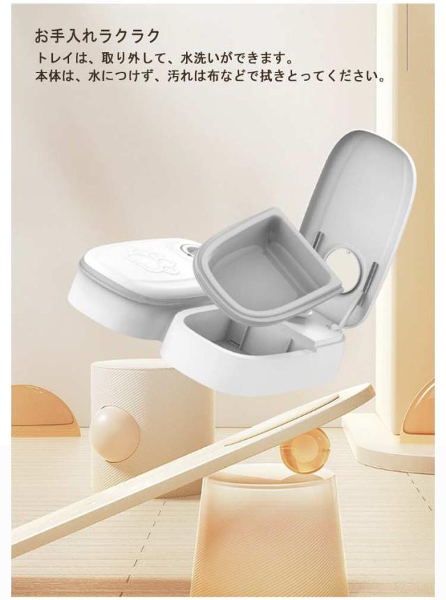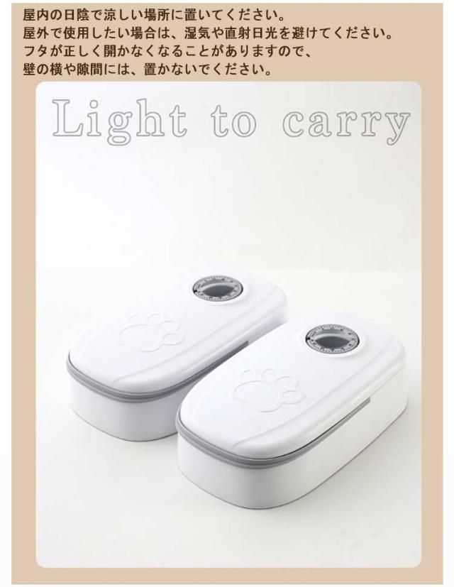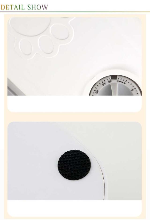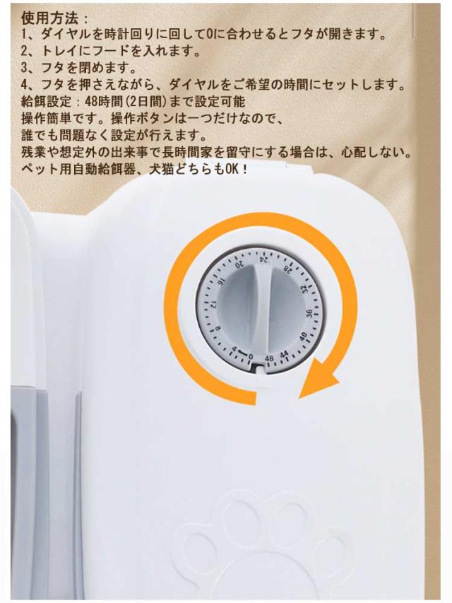 | 2つの独立したトレイで2食分の餌やりが可能!ペット用 自動給餌器。時計表示:48時間表示 環境にやさしい素材を使用していますので、人やペットにとっても安心。 シンプルなデザインで、使い勝手も抜群です。 ※単三電池が2本必要となります。商品には付属しておりませんので、ご注意ください。 【タイマー設定】次の食事の時間までの時間間隔を設定します。例えば、朝8時にその日の夜7時にペットの食事を用意したい場合、11時間後となりますので、メモリを"11"に設定します。設定した時間になると自動的にフタが開きます。タイマーは、最大2日先の48時間後まで設定することができます。 【いつものご飯を入れるだけ】容量350mlで、2回分のお食事を入れておきます。時間設定をずらして複数個用意しておくと、数回分自動で給餌することができます。 【食べやすい】フタが大きく開くので、食べやすくなっています。お食事中に容器がズレないように、滑り止めが付いています。 【お手入れラクラク】トレイは、取り外して、水洗いができます。本体は、水につけず、汚れは布などで拭きとってください。 【置き場所】屋内の日陰で涼しい場所に置いてください。屋外で使用したい場合は、湿気や直射日光を避けてください。フタが正しく開かなくなることがありますので、壁の横や隙間には、置かないでください。 使用方法: 1、ダイヤルを時計回りに回して0に合わせるとフタが開きます。 2、トレイにフードを入れます。 3、フタを閉めます。 4、フタを押さえながら、ダイヤルをご希望の時間にセットします。 給餌設定:48時間(2日間)まで設定可能 操作簡単です。操作ボタンは一つだけなので、誰でも問題なく設定が行えます。 残業や想定外の出来事で長時間家を留守にする場合は、心配しない。 ペット用自動給餌器、犬猫どちらもOK! | |