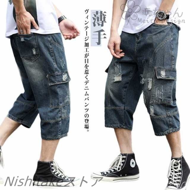 デニムハーフパンツ 夏 デニム メンズ カーゴ 7分丈 春服 デニムパンツ クロップドパンツ 春 カーゴパンツ ジーンズ ゆったり デニム 膝下丈 ダメージ加工 薄手 Gパン カジュアルパンツ 夏服 ズボン 大きいサイズ ストリート カジュアル メンズファッション