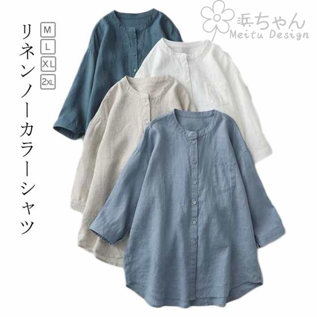 シャツブラウス レディース 麻 ノーカラー バンドカラー 七分袖 リネンシャツ リネンシャツ 前開き 羽織り 母の日 プレゼント 婦人服 トップス 春