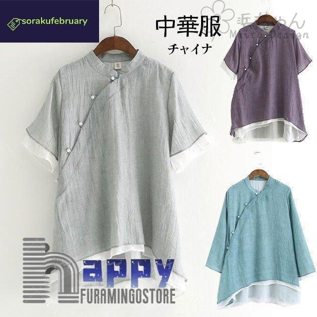 ナチュラル ブラウス レディース ス 2タイプ 半袖 長袖 無地 チャイナ風 チャイナカラー 太極拳 服 ウェア
