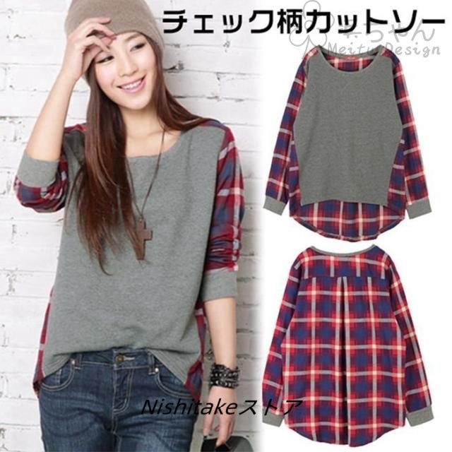 チェック柄カットソー tシャツ レディース 長袖 切り替え 春夏 トップス ゆったり 着痩せ 春コーデ