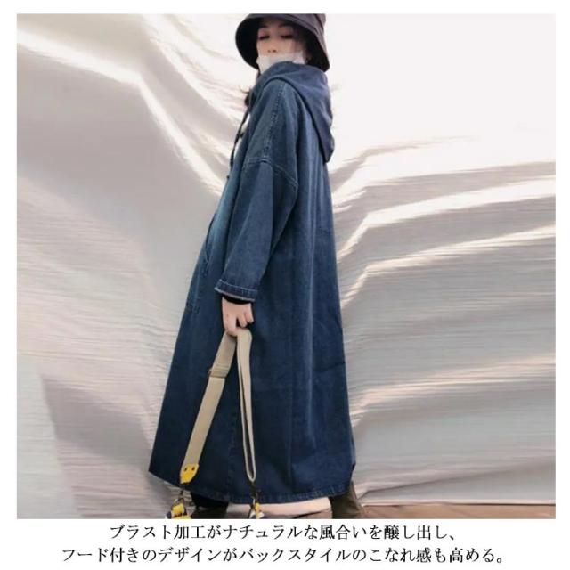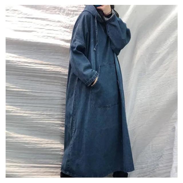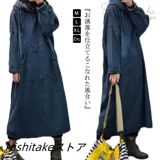 デニムワンピース フード付き ワンピース デニム パーカーワンピース パーカーワンピ 折り返し袖 長袖 ロング丈 ワンピース マキシ丈 ドロップショルダー フレア Aライン 無地 綿 レイヤード 重ね着 フレア