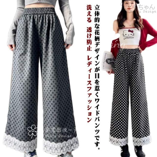華やか レディースファッション ワイドパンツ 透け防止 花柄レース ガウチョパンツ パンツ レース ボトムス ズボン ウエストゴム 洗える 花柄 ガウ