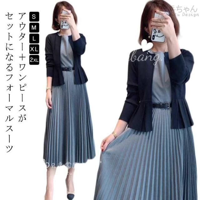 ノーカラージャケット レディース 上品 2点セット ワンピーススーツ ママスーツ フォーマルスーツ プリーツワンピース スーツ 袖なし 母親 結婚式