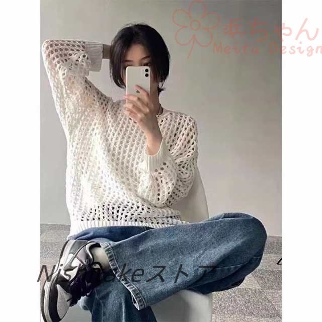 メッシュニット サマーニット 透かし編み 肌見せ 長袖 トップス 重ね着 レイヤード あみあみ 透け フィッシュネット かぎ針編み 編みニット プルオーバー 重ね着 レイヤード
