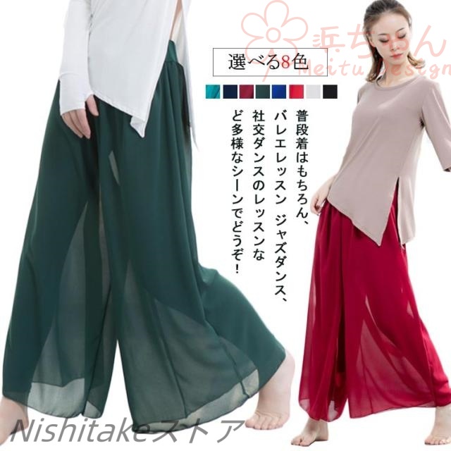 レッスンウェア パンツ ガウチョ 部屋着 ワイドパンツ レギンス付き 美脚 無地 シースルー スカンツ ダンス ヨガパンツ スカーチョ レッスンパンツ 社交ダンス ラテンダンス ヨガウェア シフォン フレアパンツ 春夏 ダンスウェア 踊りパンツ