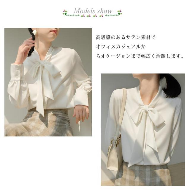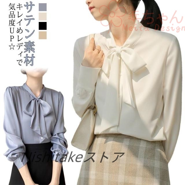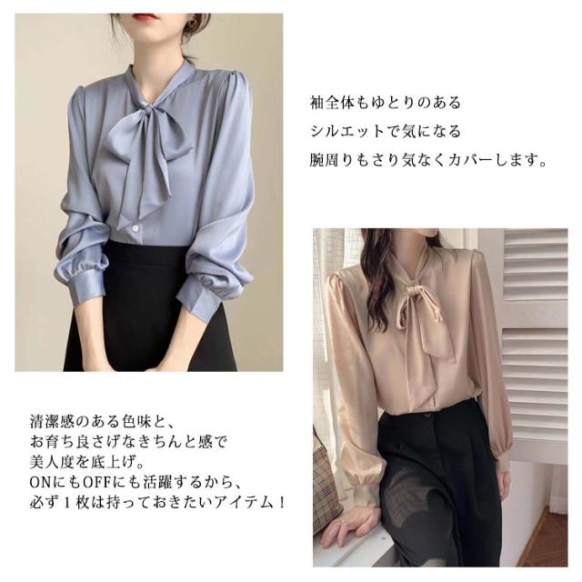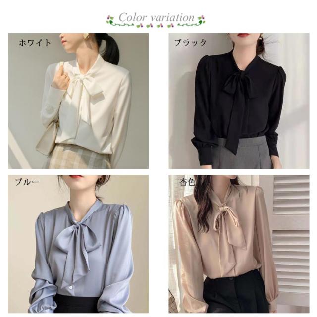 長袖 ブラウス 夏 秋 送料無料 レディース 春 シャツ リボンタイ 襟付き サテン調 ボウタイシャツ オフィス カジュアル キレイめ ゆったり ボウタイ