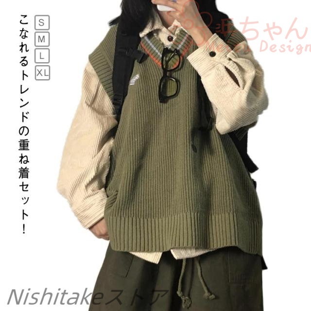 コーデュロイシャツ ニットベスト おしゃれ セーター 長袖 ニット 2点セット トップス ブラウスシャツ 重ね着 春秋 かわいい レディース ベスト 無地シャツ トップス レイヤード 体型カバー セットアップ 着?せ