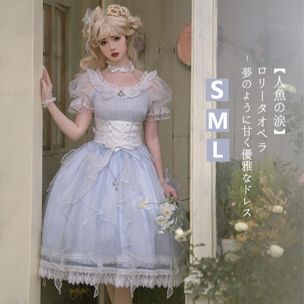 【人魚の涙】ロリータOPドレス - 春の新作 シフォン刺繍パフスリーブ ハイウエスト フリル裾 ゴシック可愛い フェミニン 宴会 パーティー ウェディング デート mj008zuzum6
