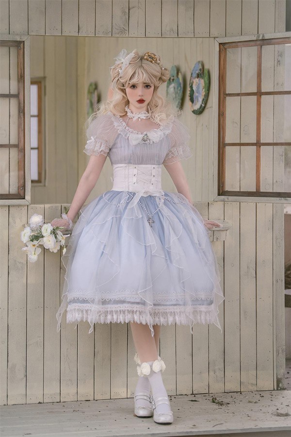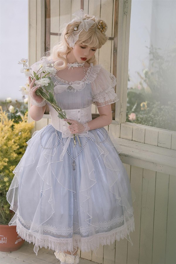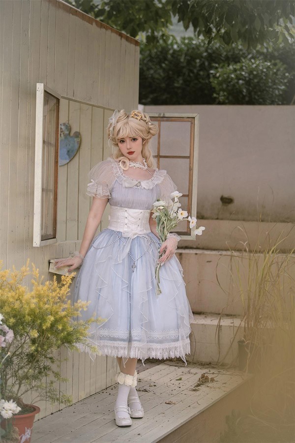 【人魚の涙】ロリータOPドレス - 春の新作 シフォン刺繍パフスリーブ ハイウエスト フリル裾 ゴシック可愛い フェミニン 宴会 パーティー ウェディング デート