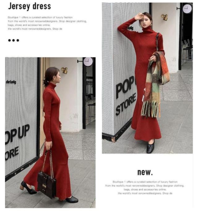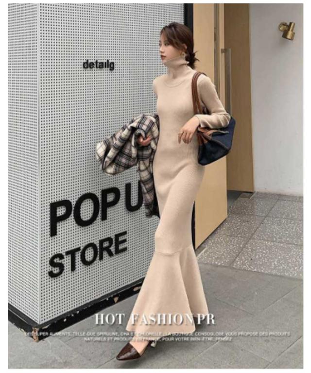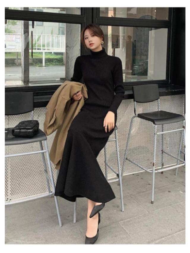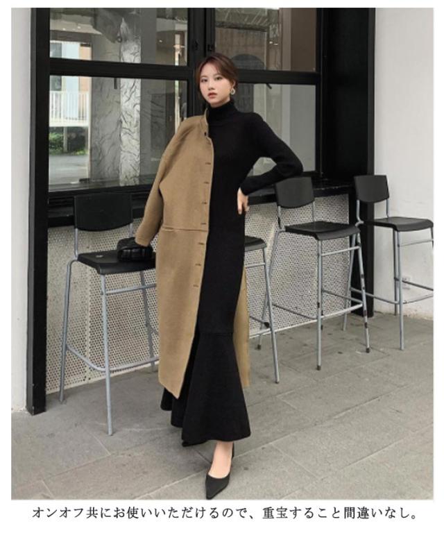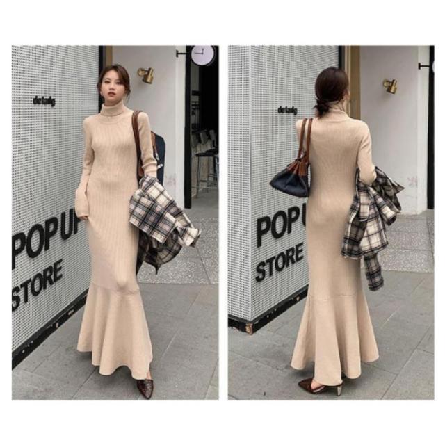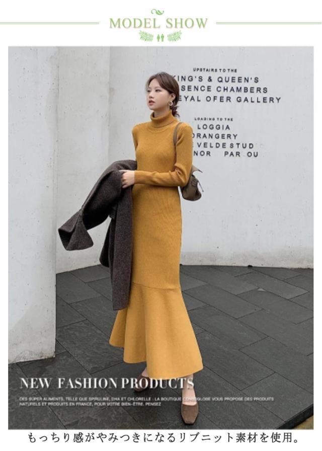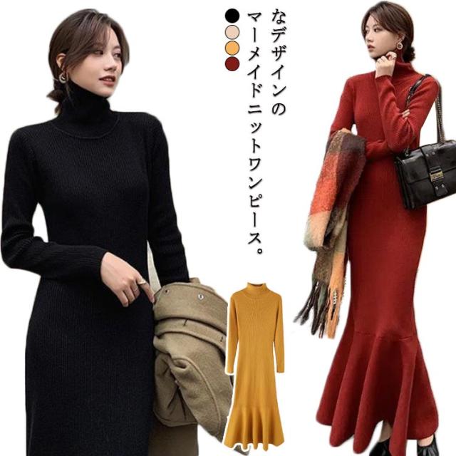 マーメイドニットワンピース フリルヘム リブニット ワンピース ハイネック ロングワンピース マーメイドスカート スリム 細身 マーメイド タイト スリム 細身 マーメイド レディース 秋冬 きれいめ おしゃれ 大人 可愛い オフィス