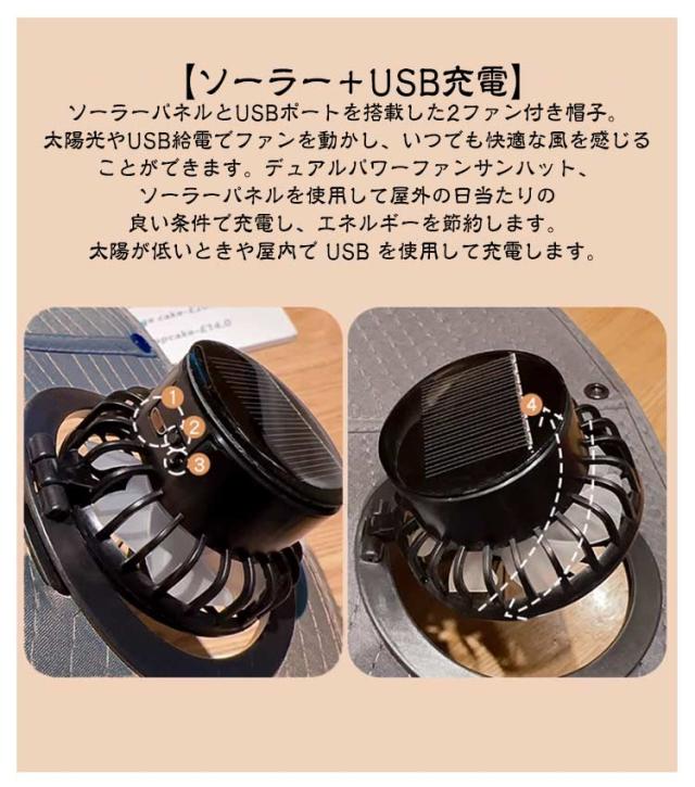 | ファン付きサンハットでどこでもさわやかな風をお楽しみください。 【快適で通気性】ファン付きサンハットでどこでもさわやかな風をお楽しみください。折りたたみ可能なデザインにより、長時間の持ち運びに便利な快適性が保証されます。ファン付きサンハットで夏の間ずっと涼しく快適に過ごしましょう。小型ファンは簡単に取り外したり、別の場所に取り付けたりできるため、多用途の冷却を提供し、屋外アクティビティに最適です。 【ソーラー+USB充電】ソーラーパネルとUSBポートを搭載した2ファン付き帽子。太陽光やUSB給電でファンを動かし、いつでも快適な風を感じることができます。デュアルパワーファンサンハット、ソーラーパネルを使用して屋外の日当たりの良い条件で充電し、エネルギーを節約します。太陽が低いときや屋内で USB を使用して充電します。 【あらゆるシーンに対応】サイクリング、釣り、アウトドア、キャンプ、バーベキュー、ガーデニング、庭仕事、DIY、遠足、運動会、通勤通学、ゴルフ、ハイキング、登山、、など、様々なシーンでご活用下さい。 | |