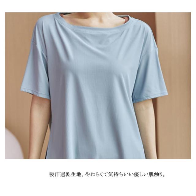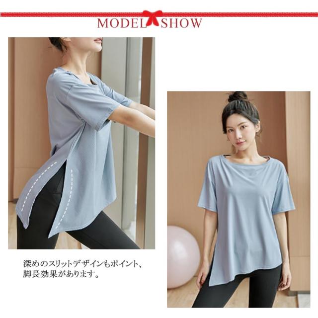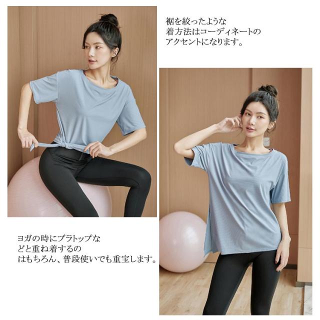 | ヨガやピラティスにもおすすめ!動きやすいスポーツトップス 吸汗速乾生地、やわらくて気持ちいい優しい肌触り。 一枚でサラッと着れて、見た目も涼しく魅せるスポーツウェア 深めのスリットデザインもポイント、脚長効果があります。 裾を絞ったような着方法はコーディネートのアクセントになります。 ヨガの時にブラトップなどと重ね着するのはもちろん、普段使いでも重宝します。 着回しのきく、シンプルなデザインも嬉しいポイントです。 | |
