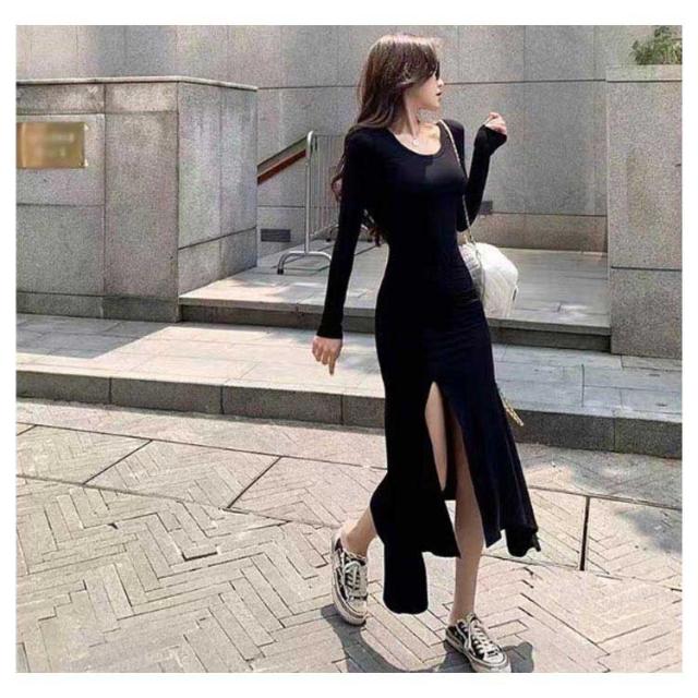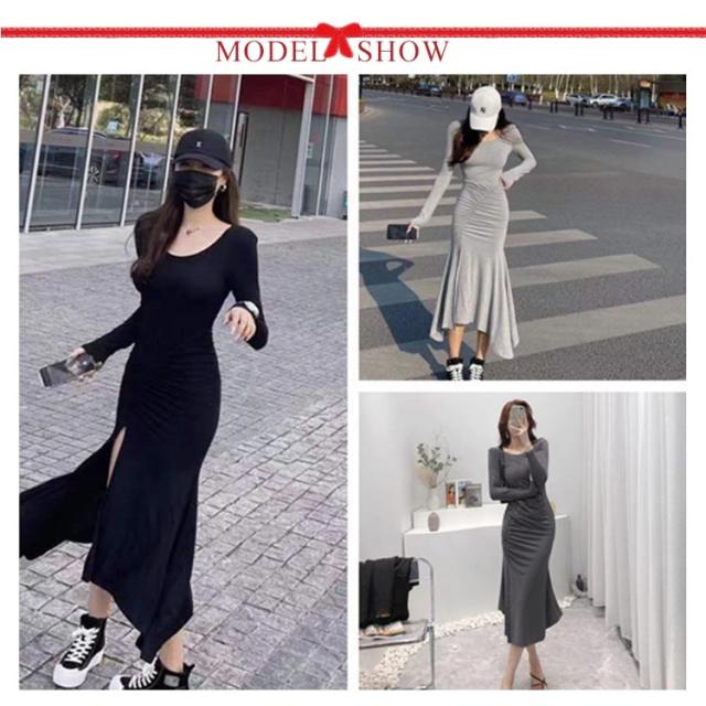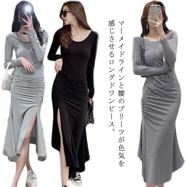 マーメイドスカート マーメイドワンピース 長袖 スリット入り タイトワンピース フレアワンピース ロングワンピース ロングワンピ aラインワンピース ブラック 黒 グレー 灰