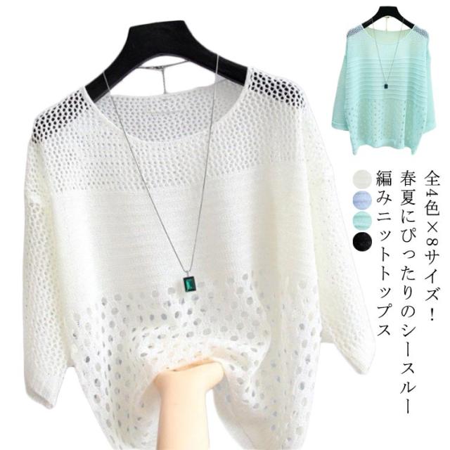透け感 無地 ニットソー シースルー編みニット 薄手 プルオーバー 透け編み クルーネック 可愛い 女性 シースルー サマーニット 日焼け対策 ゆったり 体型カバー 無地 シンプル トップス 夏 UVカット 重ね着 ニットトップス 春夏 大きサイズ 着?せ 大人 長袖