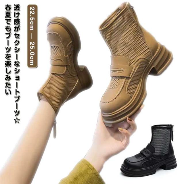 レディース メッシュ PU レザー メッシュ 厚底 サマーブーツ ファスナー ショートブーツ 夏 ラウンドトゥ ミドルヒール バックジッパー レディース 5cmヒール 切り替え 厚底サンダル 大人可愛い 韓国 オルチャン 個性的 デザイン おしゃれ